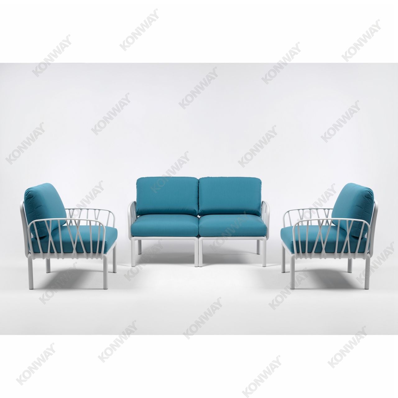 Sessel ohne Armlehnen aus glasfaserverstärktem Kunststoff mit gepolsterter Sitzfläche und Rückenlehne.